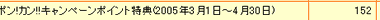 4/29に書いた通り、「ポンカンキャンペーンが後1サービスで2倍」なので1サービス利用の為に300円のHなマンガをダウンロードして680ポイントをゲットしようと言う計画だったのだが、、、3~4月のポンカンポイント付与を見てビビッタ(@@;)最初はお!152ゲットか、ヤッタネ♪、、、ん?、152?えー!152ポイント??なんでぇー??(@@?) て事でもう一度ヨク考えてみた。「590(コエンザイム)+32(ブックス)+58(おもちゃ)の計680ポイント」ココに既に罠が仕掛けられていたのだ(><;)くぅ~何も考えず590だと思って計算しちゃったけどこの590はポイント10倍キャンペーン中のポイントだった。ようするに10倍になる前の59ポイントが計算対象になるみたいだ。それで再度計算しなおすと59(コエンザイム)+32(ブックス)+58(おもちゃ)+3(ダウンロード)=152はぁ、、オイラったら150円の為に300円の買物しちゃったのねorz倍増にする時はゲットしたポイントが既に数倍になってるかを確認した方が良いですね(^^;)