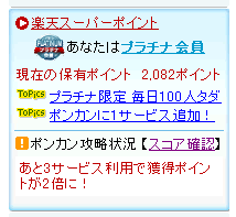 いや~いっつも楽天ポイントの文句ばかり言ってるけど何だかんだでプラチナ会員になっちゃったよ~(><;)半年で「2000ポイントかつ15回利用」って条件なのだけど思ったより簡単にクリア出来そうな気がしてきた(^^;)楽天カード使ってると6回分は「利用」をクリア出来るしアフィリエイトが一ヶ月に1ポイント入ってくればクリア出来るので12回分の「利用」は何とかなりそうだ。後は楽天で3回購入すれば15回って感じ。でもプラチナって言っても大した特典ないんだよね、、、「毎日100名がタダ」みたいな抽選的なのは当たるか微妙だし、、文句言ってても始まらないのでとりあえず何か買ってみようかな(^^;)