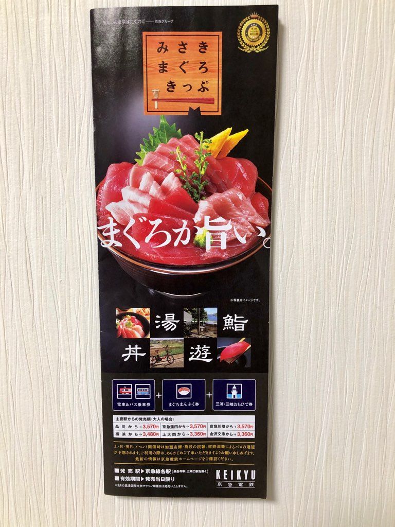 ★ 『大人の遠足』 ★京浜急行『みさきまぐろきっぷ』[油壷マリンパーク][三浦海岸 河津桜]今日は旦那君と【大人の遠足】よ京浜急行『みさきまぐろきっぷ』で《三浦半島》に行ってきました最寄り駅の券売機で『みさきまぐろきっぷ』を買って・・・「みさきまぐろきっぷ A」:電車・バス乗車券「まぐろまんぴく券 B」:お食事券「みうら・みさきおもひで券」:施設入場料などの3枚セットになってますさ~~~て、『大人の遠足』の始まりです電車に乗って1時間ちょっとで《三崎口駅》に着きました駅には案内所があって河津桜も咲いていました本当はバスで《三崎港》に行く予定だったけどバスが満員で乗れなくて・・・(汗)次のバスまで待つ事になっちゃったそしたらちょうど『油壷マリンパーク』行きのバスが来たので急きょ、行き先変更!15分ほどで『油壷マリンパーク』に着きました入場券は「三浦・三崎おもひで券 C」ちょうどお昼なので園内のレストラン『ログテラス』で「まぐろまんぷく券 B」を使って『鮪づくし丼』食べました(もちろん“カンパ~~~イ!”付き)旦那君は250円足してグレードアップの『海鮮丼』にしたのよお腹もいっぱいになったので園内を見学~~~『いるか・あしかパフォーマンス』『水族館 魚の国』『カワウソのお食事』『すいぞくかん学園潮風校舎・展望台』2時間たっぷり見学してバスで『三崎口駅』に戻って電車で1駅『三浦海岸駅』に着きました『河津桜』を観ながら“テクテクテク・・・”『菜の花』もキレイに咲いていました歩いて20分で『小松ヶ池公園』に着きましたまだちょっと早かったようで2分咲き位満開になったらもっとキレイなんでしょうね~~~夕食は《三浦海岸駅》近くの[廻転寿司 海鮮]車じゃないから旦那君も飲めるよ~~~先ずは『まぐろ満開セット』をオーダー6種類の鮪の握りが味わえます後はアラカルトでね『サザエのお刺身』や『マグロのフライ』美味しいね♪美味しい~~~♪♪♪お腹いっぱいになって《三浦海岸駅》に戻ると『河津桜』がライトアップされていました(夜桜もキレイでしょうね~~~)これから『みさきまぐろきっぷ』で帰りま~~~す切符は駅でハンコを押してもらって記念にもらってきましたとても充実して1日で楽しかったまた、行きたいな・・・***********ブログランキングに参加中です よろしかったら↓を“ポチッ!”してね♪☆★☆琴&鈴ちゃんニット☆★☆☆★☆ 旅行日記 ☆★☆☆★☆ お散歩日記 ☆★☆