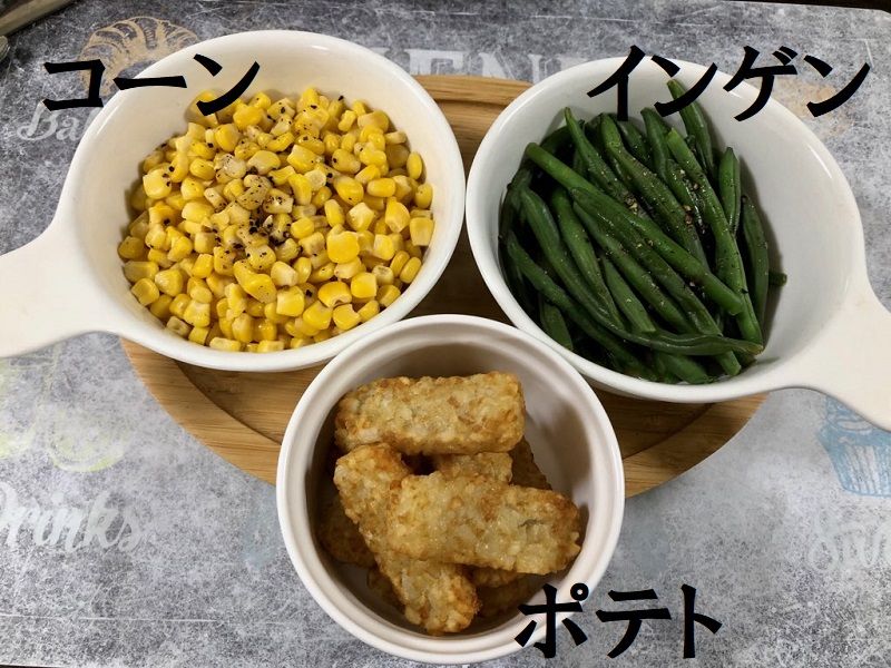 付け合わせの『コーン』『インゲン』『ポテト』は