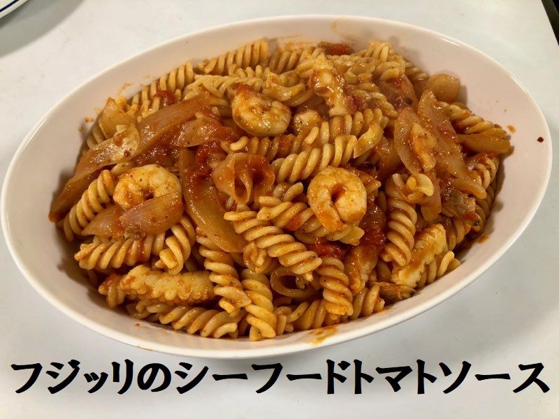『フジッリのシーフードトマトソース』『春菊のごま和え』