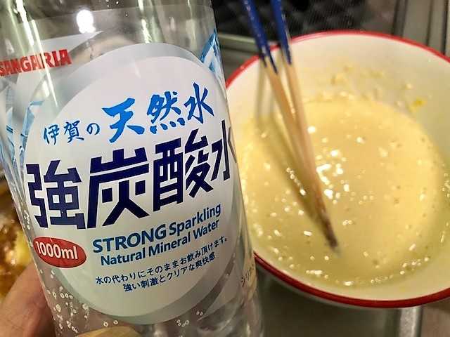 ころもは「小麦粉」に「玉子」「炭酸水」を入れて