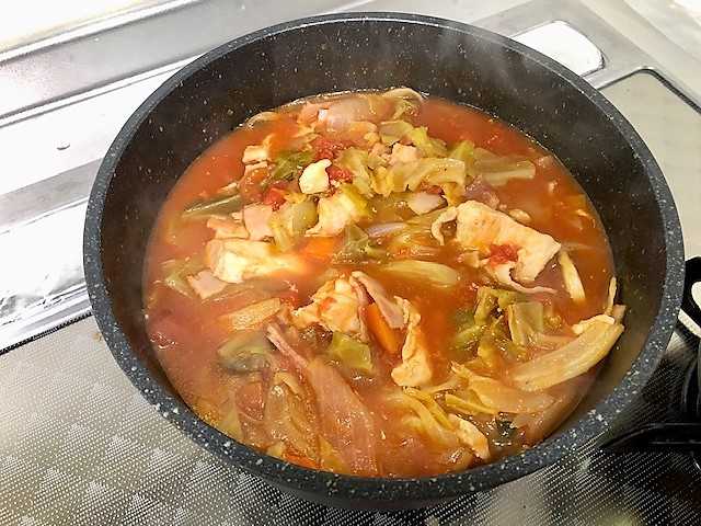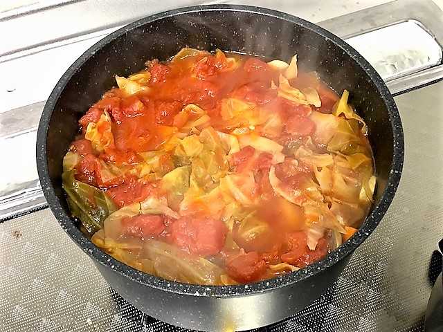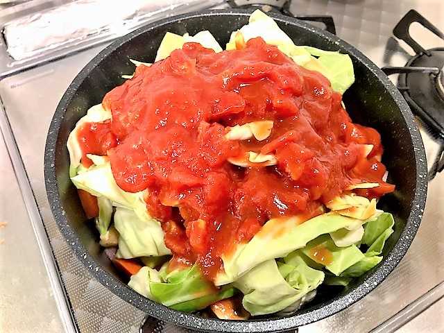 その上にキャベツ・カットトマト缶