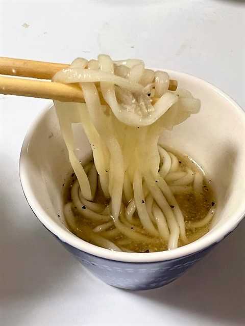 乾麺の「稲庭うどん」を別鍋で茹でてスープに入れて
