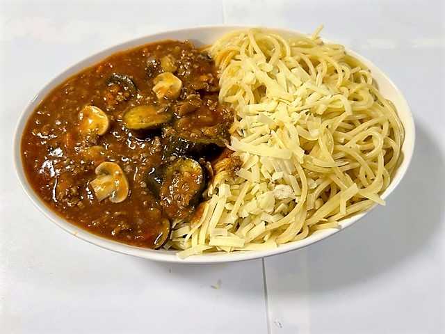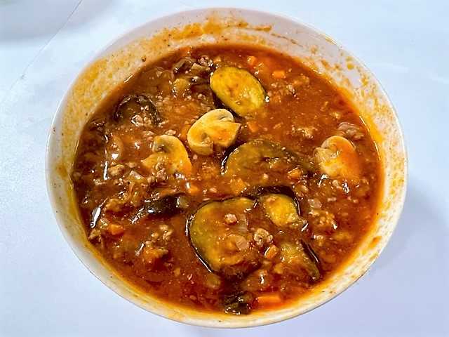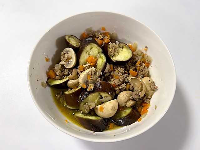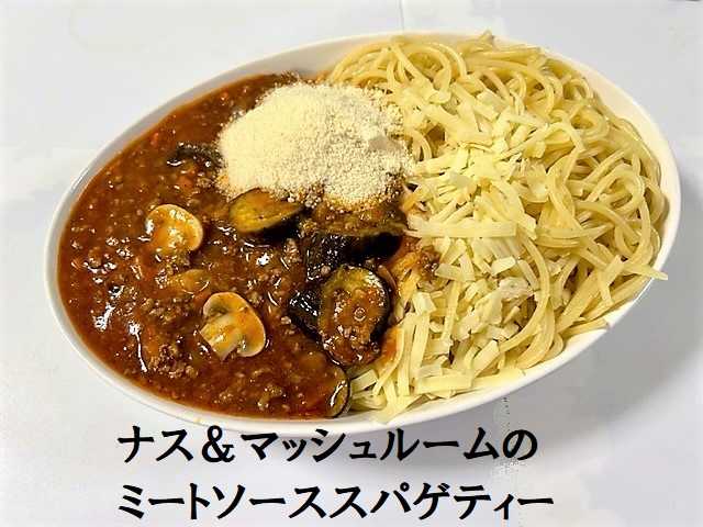 「ナス」「マッシュルーム」「市販のミートソース」を