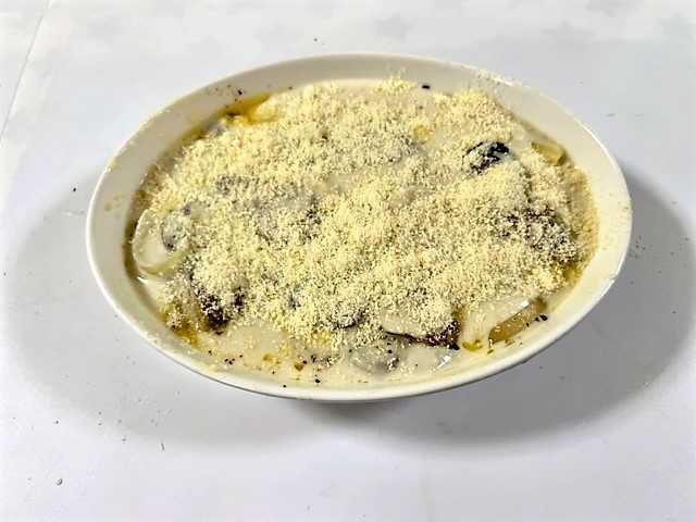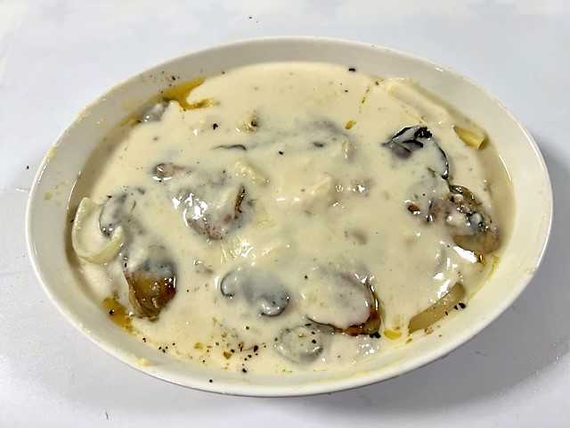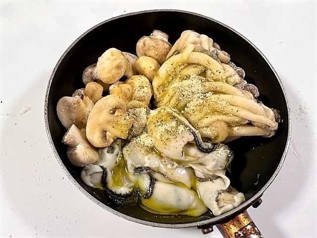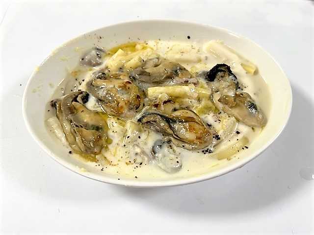 マカロニ・ホワイトソースの具・牡蠣をのせて
