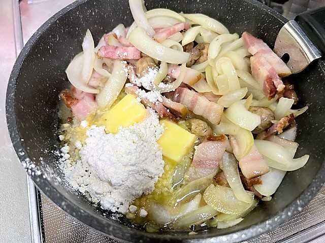 先ずは、玉ねぎ・ベーコン・マッシュルームを炒めて