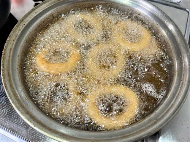「オニオンリングフライ」と「じゃがいも」を揚げて