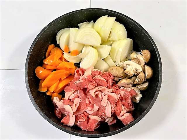 「牛肉」「玉ねぎ」「にんじん」「マッシュルーム」を