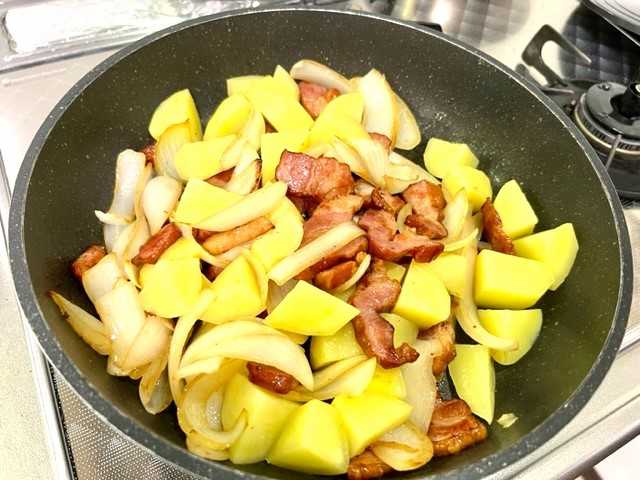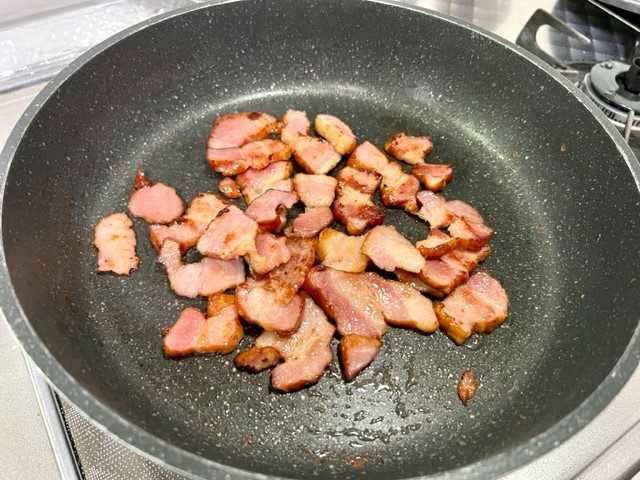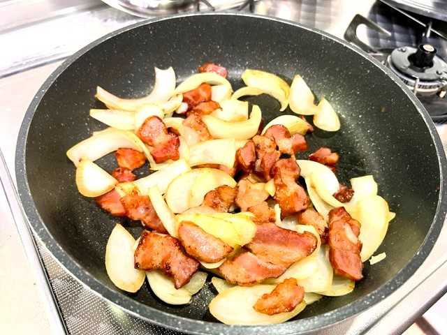 「ベーコン」を炒めて「玉ねぎ」入れて更に炒めて