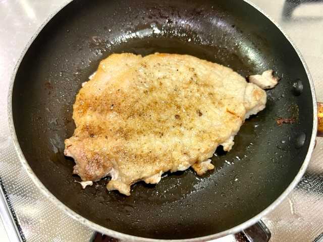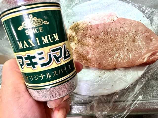 「豚肉」に「マキシマム」少々かけてフライパンで焼いて