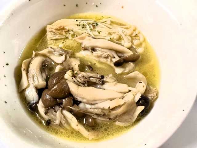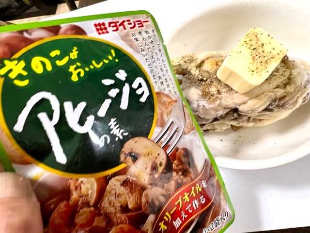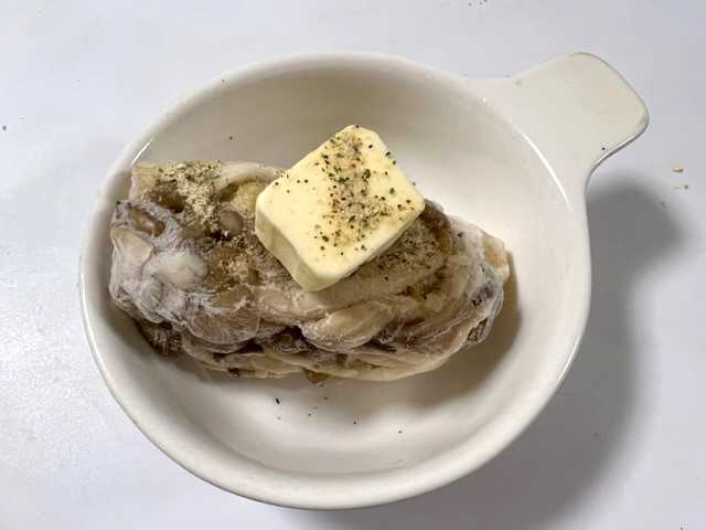 耐熱皿に「きのこ類」の上にバター&白ワイン(料理酒)