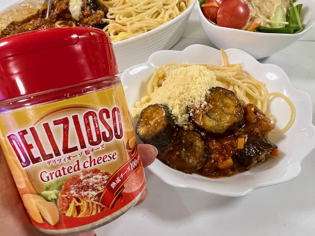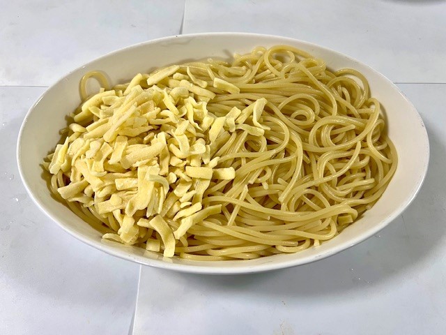 深めのお皿に茹でた「スパゲティ―」と「とろけるチーズ」