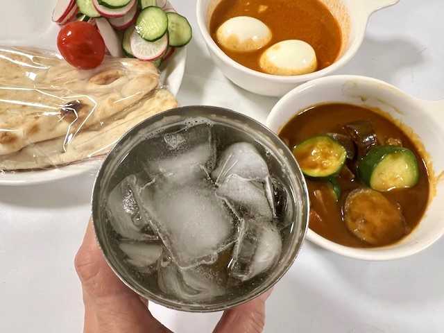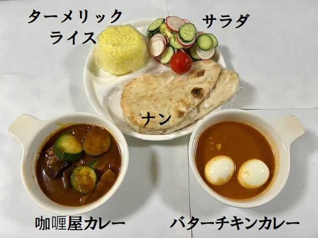 『サラダ』『ターメリックライス』『ナン』をプレートに盛って