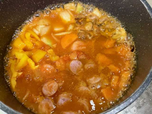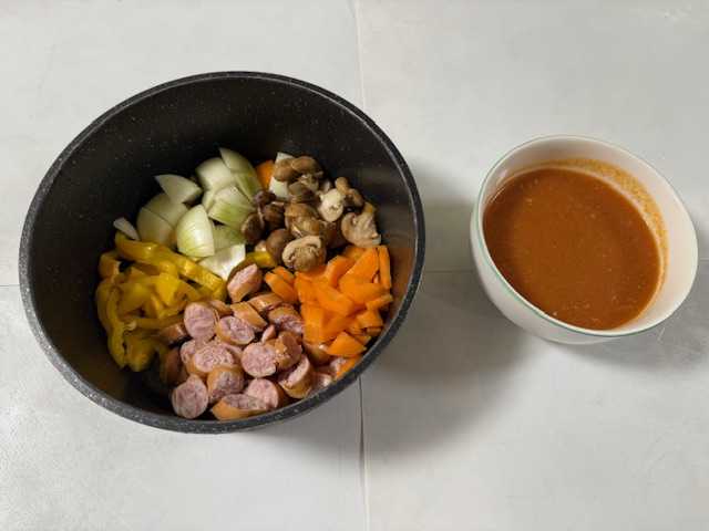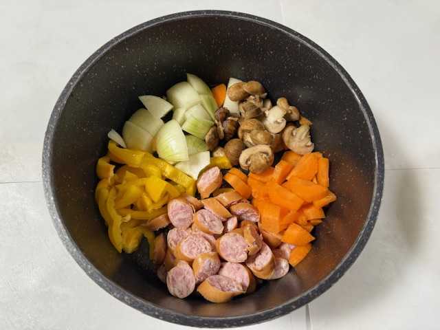 鍋に、玉ねぎ・にんじん・パプリカ・ウインナー・マッシュルーム