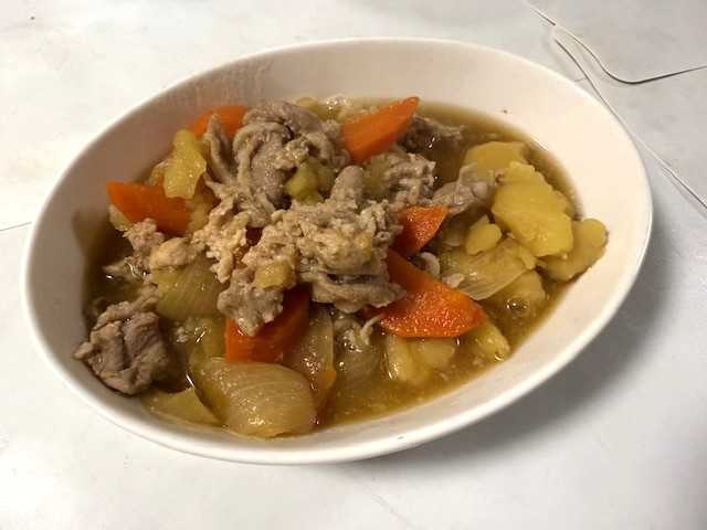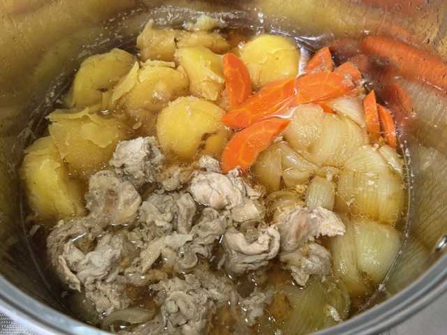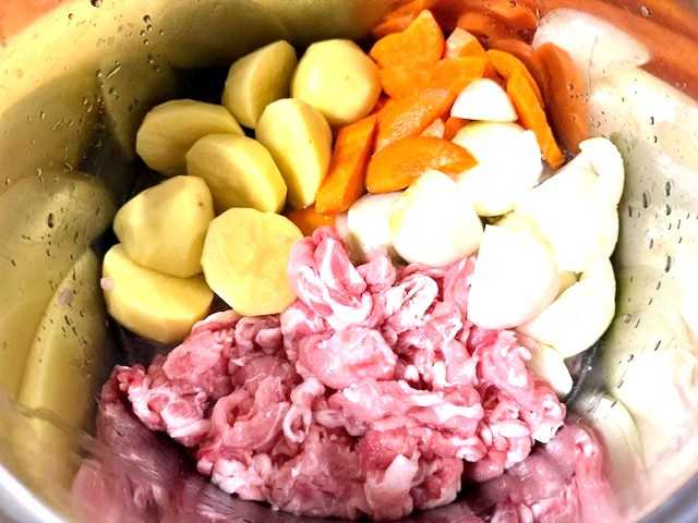 鍋に、豚ロース超薄切り・玉ねぎ・にんじん・じゃがいも入れて