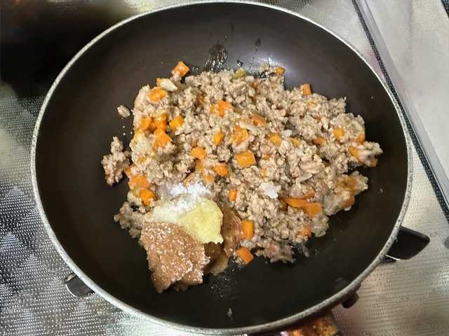 「ひき肉&玉ねぎ&にんじん炒め」をフライパンに入れて