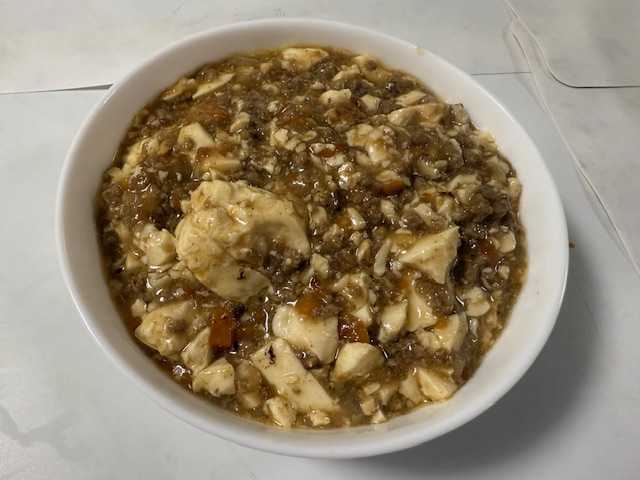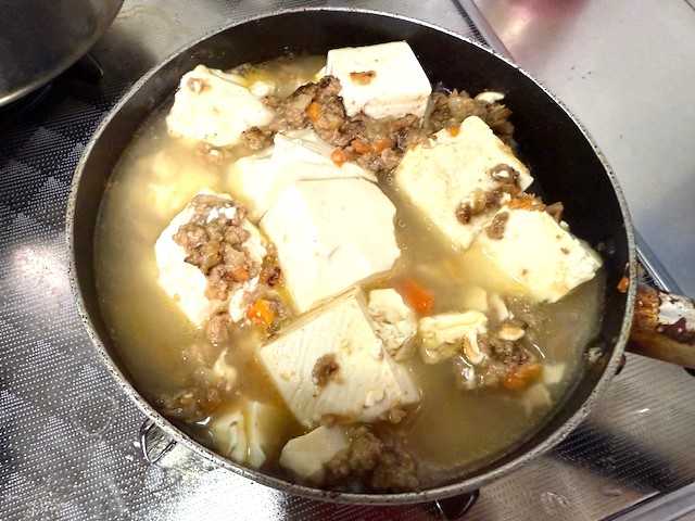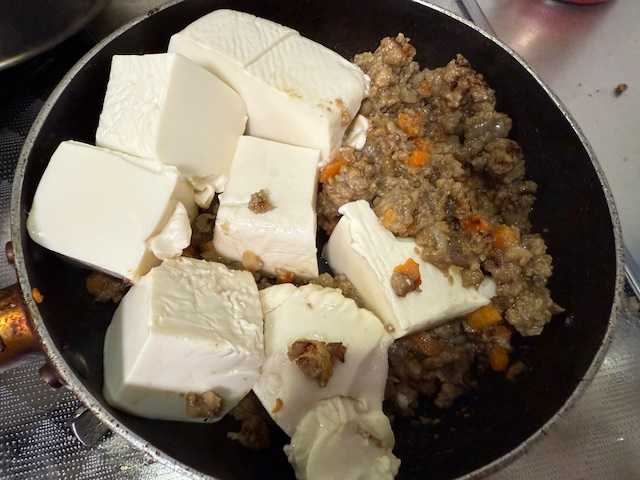 水切りした「豆腐」と水を入れて片栗粉でとろみつけて