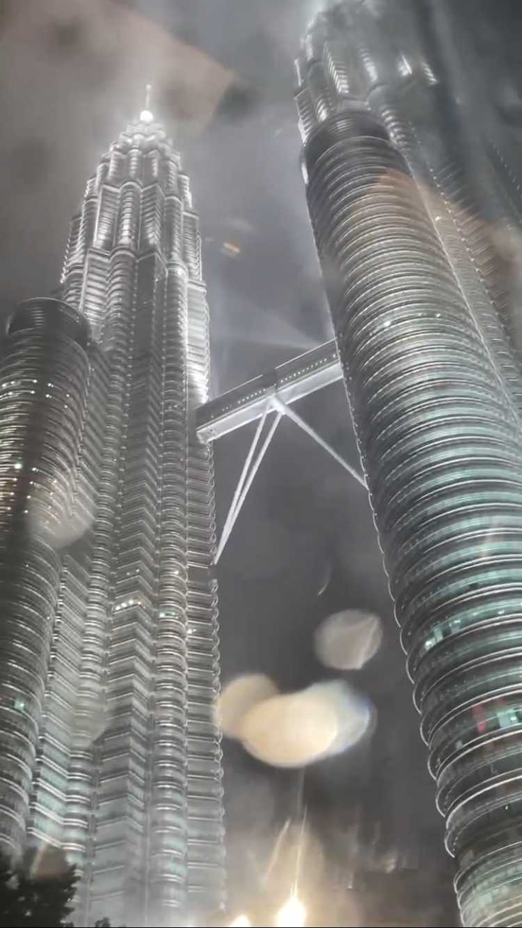 雨に濡れたツインタワーのライトアップも