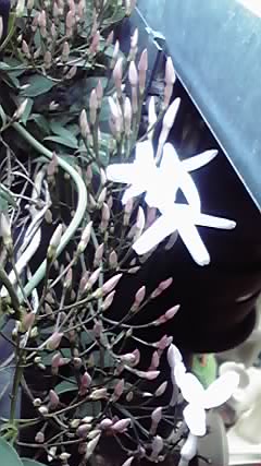 今朝、キッチンの窓から、ジャスミンが蕾をつけ始めたのをみつけた。今から10年以上も前に鉢植えの羽衣ジャスミンを買ってきた物を、狭い庭に植えたもの。蔓がどんどん伸びるばかりで、全然咲かなかった…10年間…ところが、一昨年初めて咲いたのだ。それも、これまで、伸びに伸びた蔓全体に!キッチンが南東にあるんだけど、キッチンを囲む様にぐるりと伸びている蔓に。一面、真っ白!窓を開けると、家中がジャスミンの香りに包まれるほど。これを何年間待っていたのだろう?私の夢だった。ところが、一昨年というのが、かん治療の真っ最中で、しかも抗がん剤治療…匂いに敏感で、吐き気が起きない匂いは、レモンぐらいしかなかった時…あれほど待ちわびたジャスミンの花なのに…香りに拒否反応。悲しかった…今朝、そんな事思い出しながら、今、以前のように、香りを楽しめる事がこんなにも幸せなんだと、心から思った。