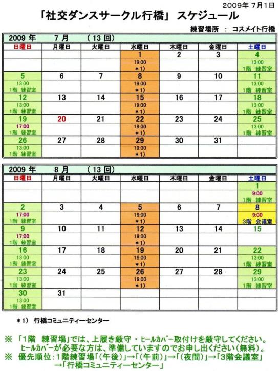 7・8月のスケジュールをアップします。またまた会員さんのご紹介で、昨日から女性の新規会員さんが1名増えました。経験者の方で中級で練習されるのではないかと思いますが、どちらでもOKですからお気軽にご参加ください。皆さん、どうぞよろしくお願いしま~す。7・8月は、どちらも、 13回/月 ずつの練習となりますから、効率よく習得できるように、できるだけ 4回/月 以上のご参加をお願いしま~す♪