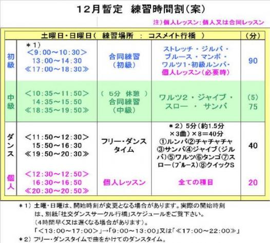 12月は、より楽しく、より効率良く練習するため12月暫定「練習時間割」(案)を考えてみました。今後、決定して行きますので皆さんどうぞご検討ください。≪変更の内容≫ 【1】 土曜・日曜共に「前半初級」「後半中級」に統一 ・ストレッチは最初に行い、初級の方対象とします。中級の方は練習前に、自主的に 実施していただき、中級の練習時間不足解消に当てます。 ・土日の開始時刻は間違え易かったので統一。 【2】 現在2時間ずつの、初級・中級の練習時間見直し ・初級(時間短縮) 現行は2時間たっぷりの練習時間です。逆に、当然のごとく経験が足りないため、 身体に負担が掛からないように休憩を多く取るように心掛けていましたので、今後 は時間短縮して、効率良く練習する予定。 ・中級(時間延長) 種目が多く、難易度が高い割りには練習時間が短かったので今後時間延長予定。 【3】 踊って楽しめる時間帯を延長 ・現在中級の時間帯にあるダンスタイム20分を更に延長。初級・中級の区分無く、自由 に踊れる時間帯を40分間確保(フリー・ダンスタイム)。 ※ 水曜日は、変更ありません。