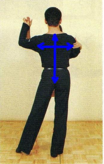 ルンバの立ち方 (1) みぞおちを引き上げます。 *背骨を真っ直ぐに伸ばします( 写真「上下の矢印方向」へストレッチ )。 *あばら骨も引き上げます。 (2) 背中を広く。 *両腕を「肩甲骨から」外側へ伸ばします( 写真「左右の矢印方向」へストレッチ )。 左右菱形筋を伸ばします。 *胸を張ることを意識してしまうと背中が狭くなってしまいバランスが悪くなるので、 背中を広く意識することが重要。 *オープン・ポジションでも、同様に背中側を意識して立ちます。 ※ この上下左右のストレッチ感は、スタンダードでも共通です。 お尻の底(骨盤底筋)を引き締めて、上下左右にストレッチを意識しましょう。