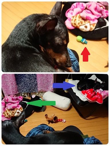 そのマースは珍しく毛布に潜っています(緑矢印)