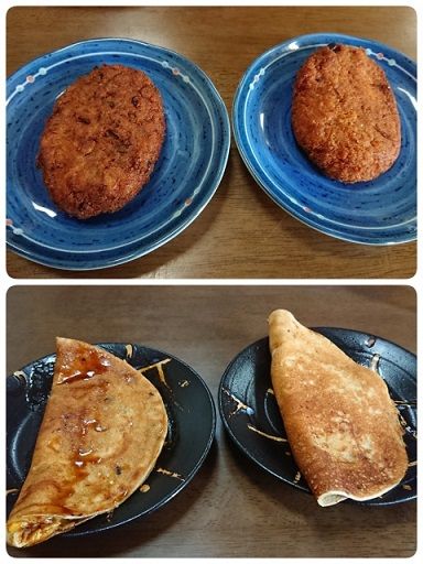 鉄板の上でネギ・肉・卵を入れて薄く焼かれたものです。
