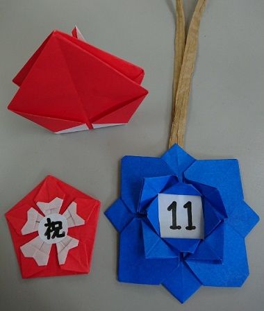 折り紙で作ったものと赤いつなぎで