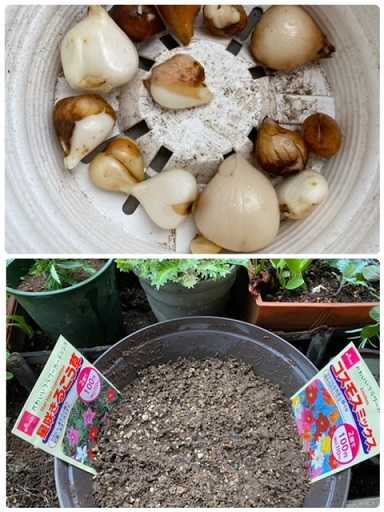 球根は陰干しにしてから網にいれて風通しの良い所に保管。