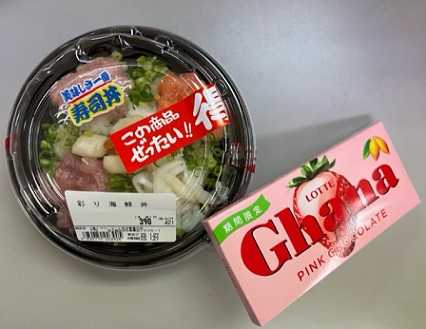 スーパーで海鮮丼と期間限定「ガーナピンクチョコレート」を買いました。