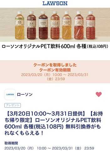 第4週(3/20~31)はコンビニLのPET飲料がもらえます。