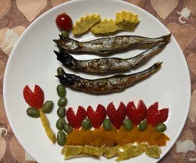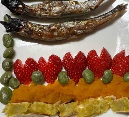 赤色は「いちご」で、上の方はミニトマトとさつまいもケーキです。