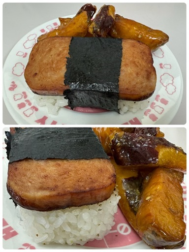 昼食に「SPAMむすび」と大学芋を食べることにしたので