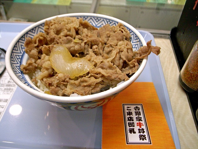 吉野家牛丼祭 久し振りに牛丼を食べてきました。復活祭は仕事で行けずに本当に久し振りです。去年、台北に行った際、台北駅近くにあった吉野家で食べましたが日本と量も味も全然違う物でがっかりしました。地元の吉野家に出かけると行列は無く2~3人が待っている状態ですぐ入店できました。店頭にはかなりの行列を予想したか警備員が待機していました。お聞きしたら行列の長い時で10人程度との事です。店に入って様子を見ていると原因が多少理解できました。今日は店長が厨房にいて牛丼が出てくるのが早い!!お客も常連客がほとんどで食べるのも早く食べ終わるとサッサと帰る。回転が早いので並ぶお客さんも少ない。よって、行列が出来ない!!味は同じだと思ったが多少、味付けを変えたそうです。