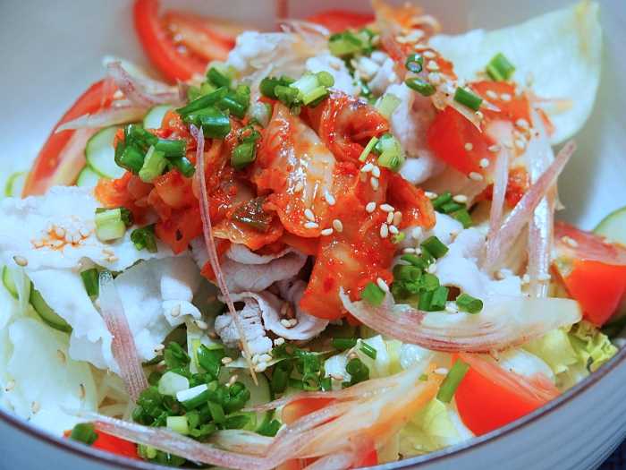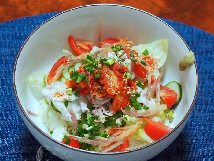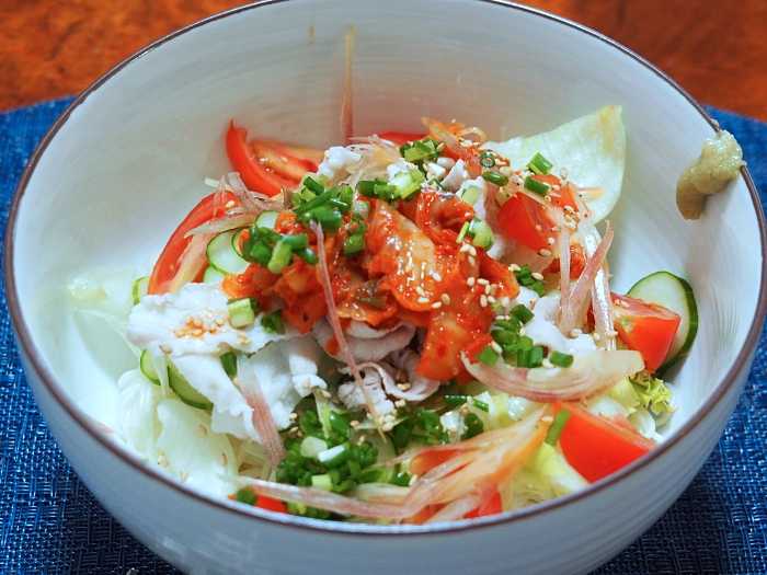 涼しく しかし、まだまだ冷たい物が食べたくなる 今日この頃 豚しゃぶにキムチ・・・ そして、ミニトマト 刻みネギにミョウガ 冷たいソーメンは今年最後の夏の贅沢を味わいます