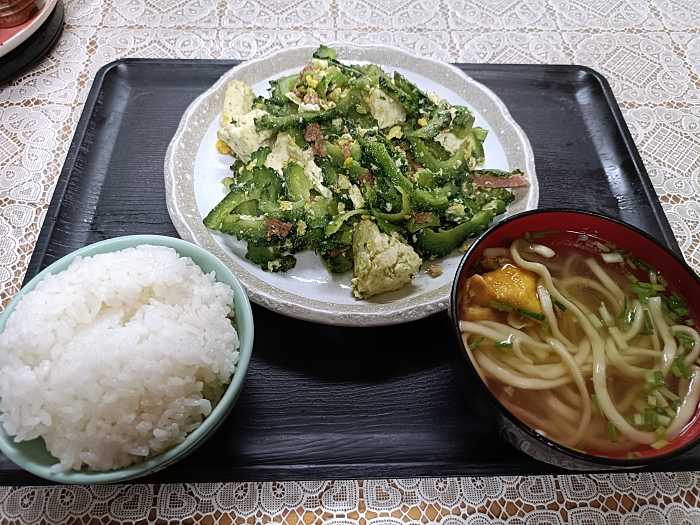 沖縄の夏は長くて5月から11月頃までは暑い日が続きますそんな長く暑い日にはビタミンを豊富に摂取しないといけませんね那覇市は『与儀』にあります『すずらん食堂』へGOおば~が厨房に3人?鍋を振る『ゴーヤーちゃんぷる~800円』最近、700円から800円に値を上げましたまぁ、今のご時世でこの料金は適正でしょうねだって量が多いんだものそして、沖縄の食堂あるあるスープはみそ汁ではなく、お椀の沖縄そばが付く島豆腐、コーンビーフ、ポークランチョンミートそして、沢山のゴーヤー暫く食べ進めても減らないのここのゴーヤーが食べたくなりますいつもいつも見て戴きありがとうございます!ブログリンクに参加しています。ポチッ!とお願い致します!B級グルメランキング放浪記ランキングおうちごはんランキングタイ旅行ランキング
