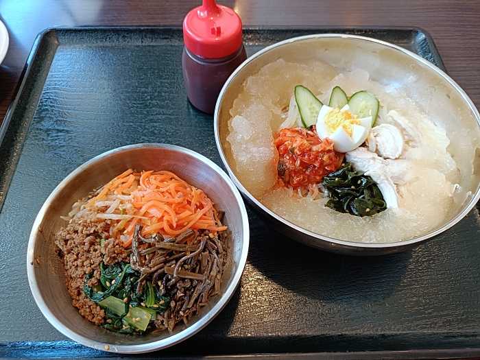 暑い夏には美味しい冷麺が頭をよぎる冷たくてコシのある麺・・・癒やされるなぁ・・・と思いつつ、以外と無い沖縄の『冷麺』無くても熱々の『スゥンドゥブ』を食べようではないの?と・・・出かけて来たのは・・・沖縄の中部にあります北谷町の『スンドゥブ ドゥビドゥブ』メニュー見ると『夏季限定』の文字に冷えた冷麺1択でっすよ『冷麺とビビンバセット(1280円)』鶏肉、ゆで卵半身、キュウリ、ワカメ、キムチのラインナップ冷麺の発祥は『北朝鮮のピョンヤン』なんだって ピョンヤン冷麺っていうからねスープは氷状態で出てきますもうキンキン状態なんですよビビンバも美味しそう・・・いや、美味しいのですが麺はコシがあって頤が疲れるほどですミヤさん(奥様ってタイ語でミヤノーイ、パンラヤーといいますが)ミヤさんと奥様の事をブログではお呼びしておりますミヤさんは『海鮮スンドゥブ』(1300円)海老、ミニホタテ、イカの中華、、浅利が入るレモンピールが程よいアクセントになっていますよ美味しい冷麺を食べることが出来ましたこの夏にあと一度はお邪魔して秋からは『スンドゥブ』にしようと思います『かき氷』は次回へ・・・ご馳走様でした・・・ いつもいつも見て戴きありがとうございます!ブログリンクに参加しています。ポチッ!とお願い致します!B級グルメランキング放浪記ランキングおうちごはんランキングタイ旅行ランキング
