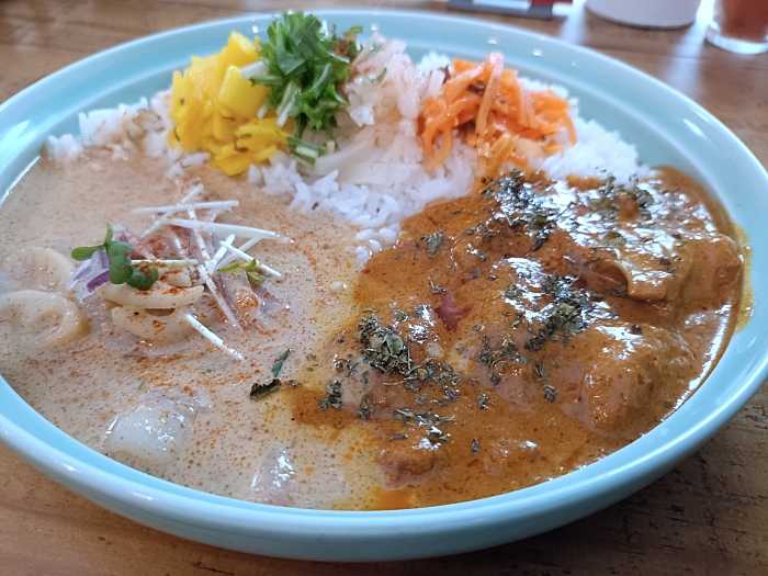 日本風でありながらスパイシーなカレーそれも2種類選択出来る嬉しいメニュー半年前には・・・2盛りカレーが1100円だったけれど時代の流れで1300円に上がってしまった(~_~;)まぁ、お米も燃料費も輸送費も高騰してる昨今ですからね那覇市は栄町市場内にあります『ヤマナカリー別邸』『鶏だし仕立て旨みチキンカレー』『海老出汁感120% 海老三昧ココナッツカレー』(これはタイ風のカレーですよね)さて、今回は・・・『濃厚鶏だしココナッツまろやかチキンカレー』『魚出汁汁仕立て県産鶏と浅利のイエロースープキーマ』酸味のある人参や玉葱夏にはぴったりの副菜が入りますここはスパイスが効いていて美味しいカレー屋さんです再訪ありのカリーでしたいつもいつも見て戴きありがとうございます!ブログリンクに参加しています。ポチッ!とお願い致します!B級グルメランキング放浪記ランキングおうちごはんランキングタイ旅行ランキング