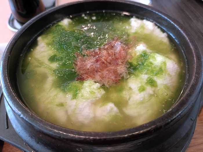 沖縄の定番メニューに『ゆし豆腐』と呼ばれている豆腐料理があります店で売られている『ゆし豆腐』内地でいう『おぼろ豆腐』のような感じのお豆腐料理ですシンプルに塩だけで食べたり鰹出汁で食べたり、味噌仕立てだったりと好き好きに味付けして食べますね今回は『鰹出汁』でorderします鰹ぶし&アーサが乗っかります副菜にはキムチ、魚フライ、おから、ハムポテトサラダが付いて800円ハムの下にポテトサラダがあります二日酔いの翌日辺りにはいい感じのランチを楽しむ事が出来ますいつもいつも見て戴きありがとうございます!ブログリンクに参加しています。ポチッ!とお願い致します!B級グルメランキング放浪記ランキングおうちごはんランキングタイ旅行ランキング