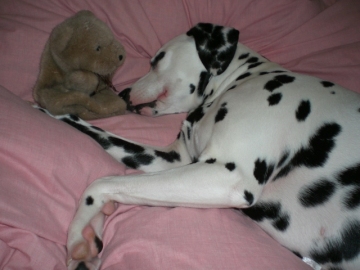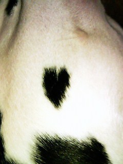 昨日は妹の誕生日のお祝いメッセージを沢山いただいて、ありがとうございました。妹も喜んでいました。なんでも、、妹の会社の方たちも私のブログを読んでくれているとかで、妹がまだ読んでいない時「○○さんって、シャンプーフェチなんですか?」って聞かれたらしい。^m^今日は更新がおそくなったけど、明日にでもまた読んでくれるかな?妹の昔話なんかも書いちゃおうかな~(いじわる姉さん)ところで、、、今日のお題。りりのぶちぶちを大公開↓↓↓これってハートですよね偶然見つけたのですが、ダルのぶちって色々な模様(斑点)で面白いです。以前、ちーさんも日記に書かれていましたが、、、^_^;ダルの子によってぶちの数や形が全然違うので、面白いですよね。ぶちが少ない子もいれば、多い子もいるしりりみたいに顔に少ない子や全体に多くある子中でも茶色のスポットが入っている「レバダルちゃん」もいるそうです。私は見たことがないので、見てみたいな~でも、やっぱりダルメシアンって、散歩してても注目されます。なので、散歩の途中の人通りの多い所でのウ○コは恥ずかしいなんとも情けない姿だし、、、お家でして来たじゃないと思っても、お外だと気持ちいいんですかねP.Sこの頃変なお天気で暑かったり寒かったりするのでみなさん風邪をひかないようにしてくださいね!昨日美容院に行ったのですが、スタッフの人たちも、結構咳き込んでました。風邪ひきさん多いみたいです。