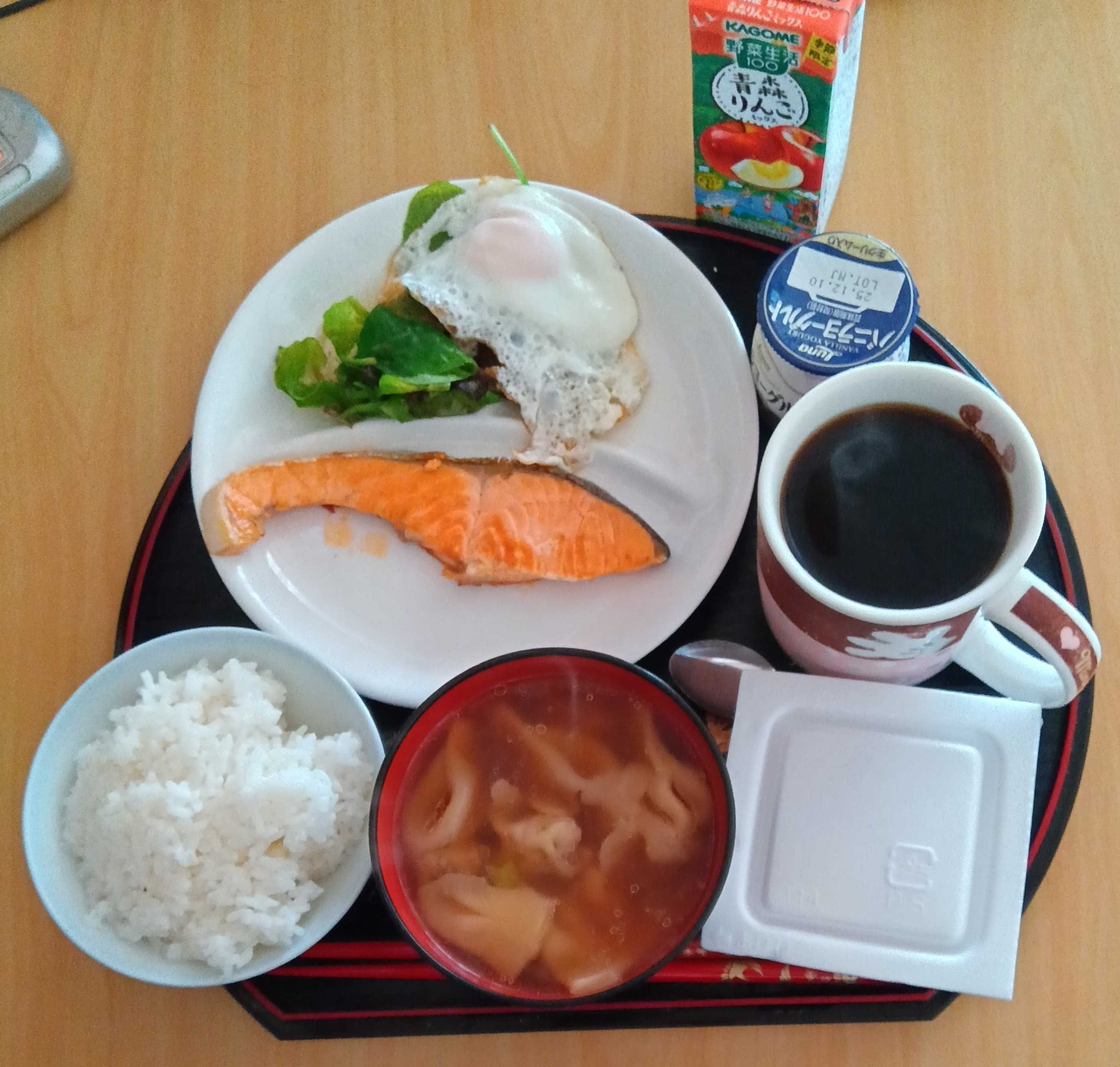 日曜日の朝ご飯は 焼き鮭とワンタン…