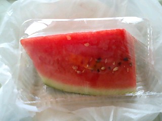 日本は果物の値段がどうも割高に感じる国じゃないかと常々思っているワタクシ。スイカなどはその筆頭に位置するのでは?!と勝手に思い込んでいたりしますし、実際に値段を見て購入をあきらめることも多いので、「好きなのになかなか食べてないのようぅ~~~」という状態ばかりが続いております。(※中国や香港に比べたら実際スイカの値段は「うげっ!」とのけぞるほど高いんですが......)さて。今年の夏は、といいますと、例年になく早い時期じゃないかと思われるこの日に、初のスイカを食することができました。99円ショップのカットスイカですけどね(苦笑)。でもスイカには変わりないし、予想していたよりは割と甘かったので、とりあえず食べられただけ良しとしようかなー、と思います。「また食べられなかったよぅ~~うわーん!(泣)」と地団駄踏みながら夏が終わるよりはまだマシだということで。