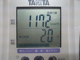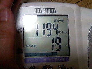『2007/07/12(木) 今日の私も20歳。』から1週間東京に滞在したため、13日~18日は体組成計測ができずじまい。この日19日(木)の夕方に自宅にたどり着き、帰宅してまもなく計測(笑)。(※食後3時間は計測しない方が良い、と説明書に明記してあるので、食事をする前に計測してしまおうと思ったのがホントのところですw)よしよし、今日のワタシはU-20だぜい♪ ←笑というわけで今度こそ「体内年齢19歳」の証拠写真。基礎代謝がもう少し欲しい気もしますが........。しかし、「体内年齢が実年齢の○分の1」というのがこれでネタとして完全に定着しそうだな.........(汗)