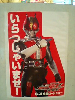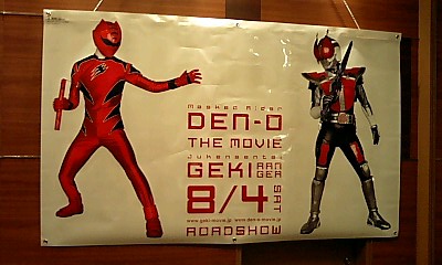 やっと......やっとこの日、映画館へと行くことができました。8月4日(土)に二本立て上映で封切りされた『仮面ライダー電王 俺、誕生!』と『獣拳戦隊ゲキレンジャー ネイネイ!ホウホウ!香港大決戦』劇場版『電王』は、ドラマ本編とストーリーが連動しているので、「本編を消化してからでないと観に行けない~」という状態になり、やっとこさ重い腰を上げて3週間弱で電王およびゲキレンジャーの3月第1週分から8月第1週分までの録画分を必死になって消化。電王の話数でいうと、8月第1週目の放送は第27話です。わざとここでストップ、ということで消化が完了したのが22日(水)の深夜。なぜわざとストップ、かというと“テレビ本編第27話 → 映画版 → テレビ本編第28話”というつながりになるように視聴するのが、どうやら一番「ピッタリと話がつながる」から、だという情報をもらっていたたためです。というわけで、22日(水)夜の定例練習の帰りに、24日(金)に観に行こうと約束をし、大きなお友達2人組で、場末の超ローカル映画館を「あえて選んで」行った次第。シネコン式のキレイな劇場だと、たぶん親子連れも多くてゆっくり鑑賞できないだろうと判断して、わざわざ場末の劇場へ(笑)。さて。受付でチケットをもぎってもらおうと思った我々は、そこで目に入ったミニポスターでさっそく大爆笑。もっ......モモタロスあんた.........「いらっしゃいませ!」ってあんた...........(ひたすら爆笑)テレビ本編をすべて見たことのある人には、これはとってもとってもツボにはまります。(『2007/08/23(木) うちの近所は...... 』もとい、テレビ本編第17話参照)いやー、キャラが直立不動するくらい立っていると面白すぎますな。で、クドクドとあらすじどうこうというより、率直に感想を。ひとことで言うともうこれに尽きます。「泣けたで~!!! (`;ω;´)」心温まる良作でした。テレビ本編第27話までの連動編と、映画本編の随所が、実に見事に「ピッタリと」つながっています。何箇所も何箇所も、第27話までのいくつかの場面とちゃんとつながっているのです。いやーなんて見事な職人技な脚本なんだ。しかもエンディングでかかるテーマソング、175Rの『夢で会えたなら』がもう反則。映画の内容、ラストシーンにはまりすぎるくらいはまっています。いやー........良い作品を見せていただきました.......(心地よい感動で涙)