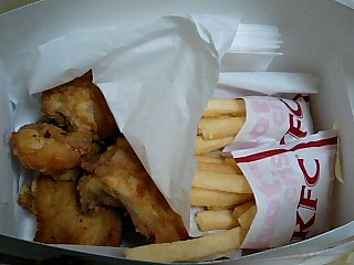 食費削減のために、1食パン1個...なんて日々がとにかく多いここ最近......じゃなくて、ここ何ヶ月か.........状況は何も好転しておりませんが、クリスマスイブ限定で、かなりの度胸をふりしぼっての贅沢を決行。ケンタッキーのピースパックです。もちろん普通のやつ。1人しかいないのにパーティパック買ってもむなしいだけですし、この通常パックに1,000円出すのが限界ですもの.......。嗚呼.......来年こそ......もうちょっと運勢向上してほしいなぁ......そう祈り続けて早何年.....なんだろう............ある意味生まれてからずっと......かも。いや、ホンマに本気でマヂメな話(遠い目)。