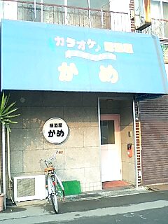 拙宅から最寄の商店街を北側に抜けた近くに、「カラオケ喫茶 かめ」なる店を発見!(・ω・)!店内はやはり磯の香りなのかしら......(・ω・;)(※「磯の香り」とは.....『仮面ライダー電王』のウラタロスを参照のこと)うーむ、「まんが喫茶 いまじん(『2007/08/08(水) んがっっっ!!!』)」といい、「居酒屋桃太郎(『2007/08/23(木) うちの近所は...... 』)」といい......やはりウチの近所はイマジンだらけだ……(-ω-`)エリア一帯憑依されてるんだろうか..........(汗)