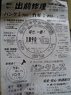 この日、やっと、やっと、本当に「やっとこさ」な状態で、自転車のカギを交換してもらいました。私の記憶ではたしか、『2007/07/02(月) やっと手続き。』よりも前から、「自転車のカギどこへやったっけ~~~?(汗)」という状態になってしまっていて。んで、そのまま「うーん、車輪の直径が大きいから、自転車屋さんまで持っていくの大変なんだよなぁ.....でも持っていけばカギ交換(問い合わせてみた店では)600円で済むしなぁ......」と延々迷い続けていたんですね。......と、いうことは......もう半年迷ってるってこと.................だよね?出張費何百円と、この悩んだ半年の時間.........ひょっとして、かえってすごくもったいなかったのかも......という気が(汗)。「今という時間の大切さ」をタイムレンジャーや電王に教えられているのに、その教えを見事に無駄にしてますな私.....(泣)。かくして。この日、「やっぱり来てもらおう」と決心し、しばらく前にポスティングされていた「自転車出張修理」のチラシを利用することに。電話してみたら、もともとこのお店の所在地が拙宅から近いこともあって「15分くらいで行きます」とのこと。待っていたら、たしかにそのくらいの時間で来てくれました。カギ交換も、始めてしませばせいぜい10分程度の作業。カギ本体800円と出張費500円で総額1,300円のお支払い。ずっと「うーん、出張費何百円かが.....」と悩んでいた私ですが、いざお願いして交換してもらうと、その悩んだ約半年の時間の方が実にもったいなかったなぁ...と実感。半年迷い悩んだことが、ものの30分で解決だもん(汗)。何百円という金額、私にはとても大きい額ですが、それにしたってやっぱり迷った時間が無駄だったなぁ.......と思いました。いやはや、実にもったいないことを.......いろんな意味で.........(ガックリ)。