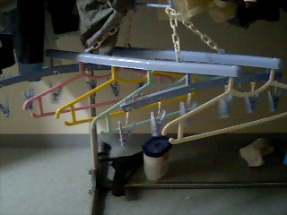 洗濯物を乾かす際に、靴下や下着用に使っていた洗濯ばさみ付物干しグッズ(名前がわからない←汗)を、100円ショップで新たに1つ自分用に黄色(笑)い商品を購入してきました。なので、引越し前のお部屋でずーっと使っていた分(写真参照)は、ゲストハウスの共同スペースにこっそり自主的に寄付しました。というのも、靴下がバランバランな干し方をされていて、一体いつ洗濯したんだかわからん靴下(もちろん男物)が床に落っこちたりしている始末。洗濯ばさみ付グッズがあれば、靴下をまとめてきちんと干せるでしょ?☆ってことで。ちなみに、写真に写っている湿気取りも、私が自主的に買って自主的に置いたものです。洗濯機2台と干し場だと、なんとなくジメジメ?と勝手に思ってしまったもので......。何せ、もちろん全部男物衣類ですが、洗濯機の中も干し場も「洗濯後入れっぱなし~」「干し場にぶら下げっぱなし~」がやたらに目に付きますから(汗)。個室ならともかく、「みんなのスペース」でそれは、アカンと思わへんのかなぁ......?(激しく疑問)